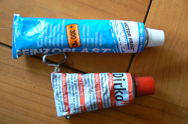 Beim Motorradschrauben habe ich sehr gute Erfahrungen mit diesen Silikon-Dichtmassen wie Dirko gemacht. Die sind auch beständig bis 300°C und kleben meines Erachtens besser. Mir macht da nur die sehr große Fläche kopfzerbrechen, weil ich die nicht überall gleichmäßig dick auftragen kann und sie sich dann vielleicht nicht so gut wegdrückt beim Anziehen.