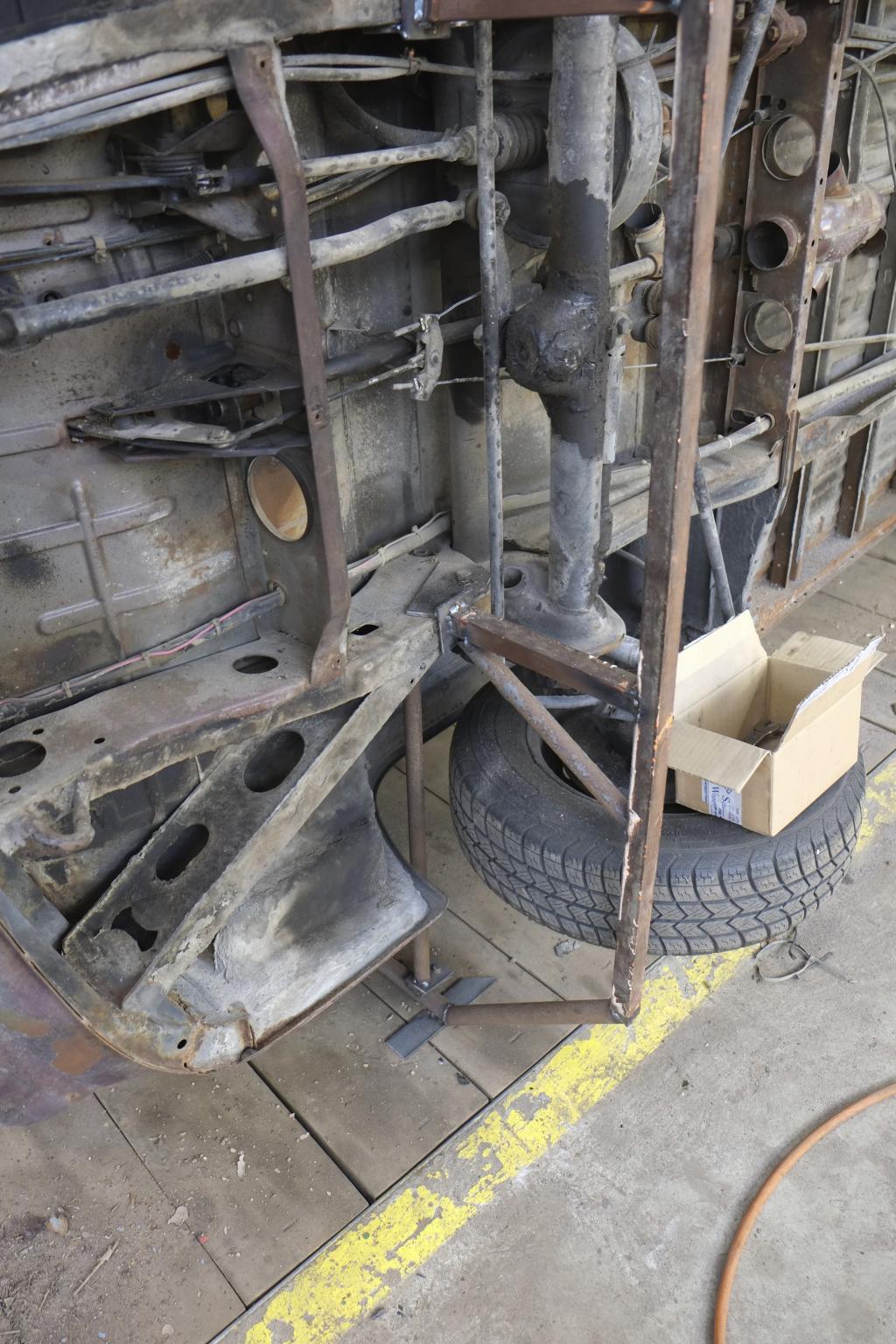 Naja... Um mein schwaches Herz ein wenig zu schonen habe ich mich dann dazu entschieden erst mal den Bulli auf die Seite zu legen. Dazu hab ich mir ne kleine Vorrichtung aus alten Rohren (vllt. Wasserrohre?) geschweisst.