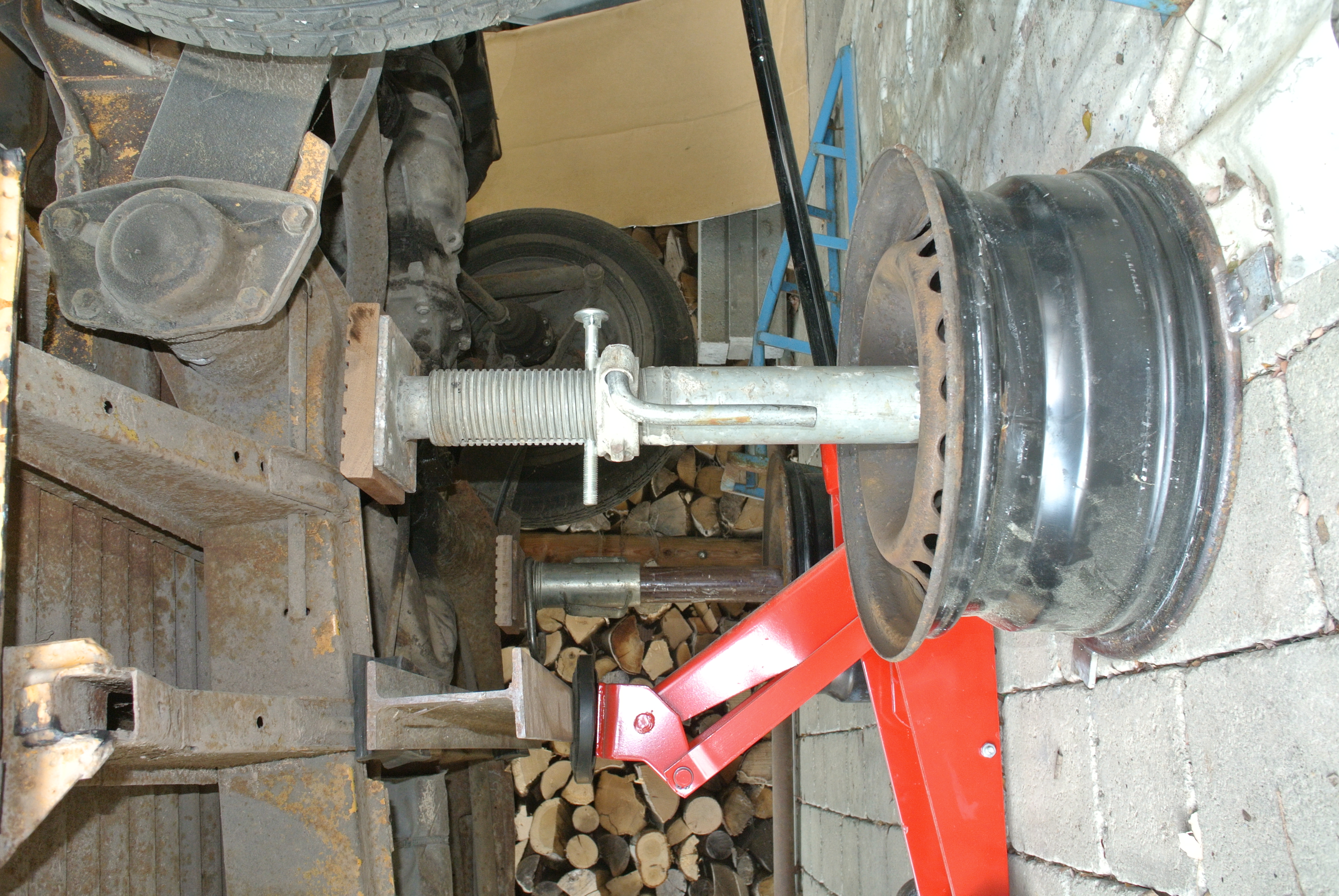 Ich habe dazu 2 Baustützen "Sprieße" auf die benötigte Länge gekürzt und in alte Felgen mit passendem Innendurchmesser eingeschweißt. Das Stützrohr steht dabei auf 3 eingeweißte Flachstähle, die zusätzlich für einen sicheren Stand sorgen. Mit einem Rangierwagenheber angehoben, komme ich durch Versetzen der Bolzen und Feinjustierung mit dem Schraubring auf eine akzeptable Höhe. Eine der Achsen bleibt dabei immer auf den Auffahrrampen und damit auf den Rädern. Meine Bus steht unter einem teiloffenen Carport, damit ist das Aufbocken auch ein wenig ein Diebstahlschutz. :D