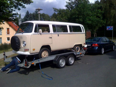 um Probleme zu vermeiden, haben wir uns damals entschieden, einen Transporter zu mieten. Der Bus stand fast 700km weit weg, da wollten wir uns das mit nem Hänger nicht antun. Allerdings ist uns auf der Hälfte des Rückweges ein hinterer Reifen geplatzt. Waren zum Glück Zwillingsreifen, da ist der Transporter nicht gleich umgekippt. Hat aber schon mächtig Last auf dem Heck gehabt...
