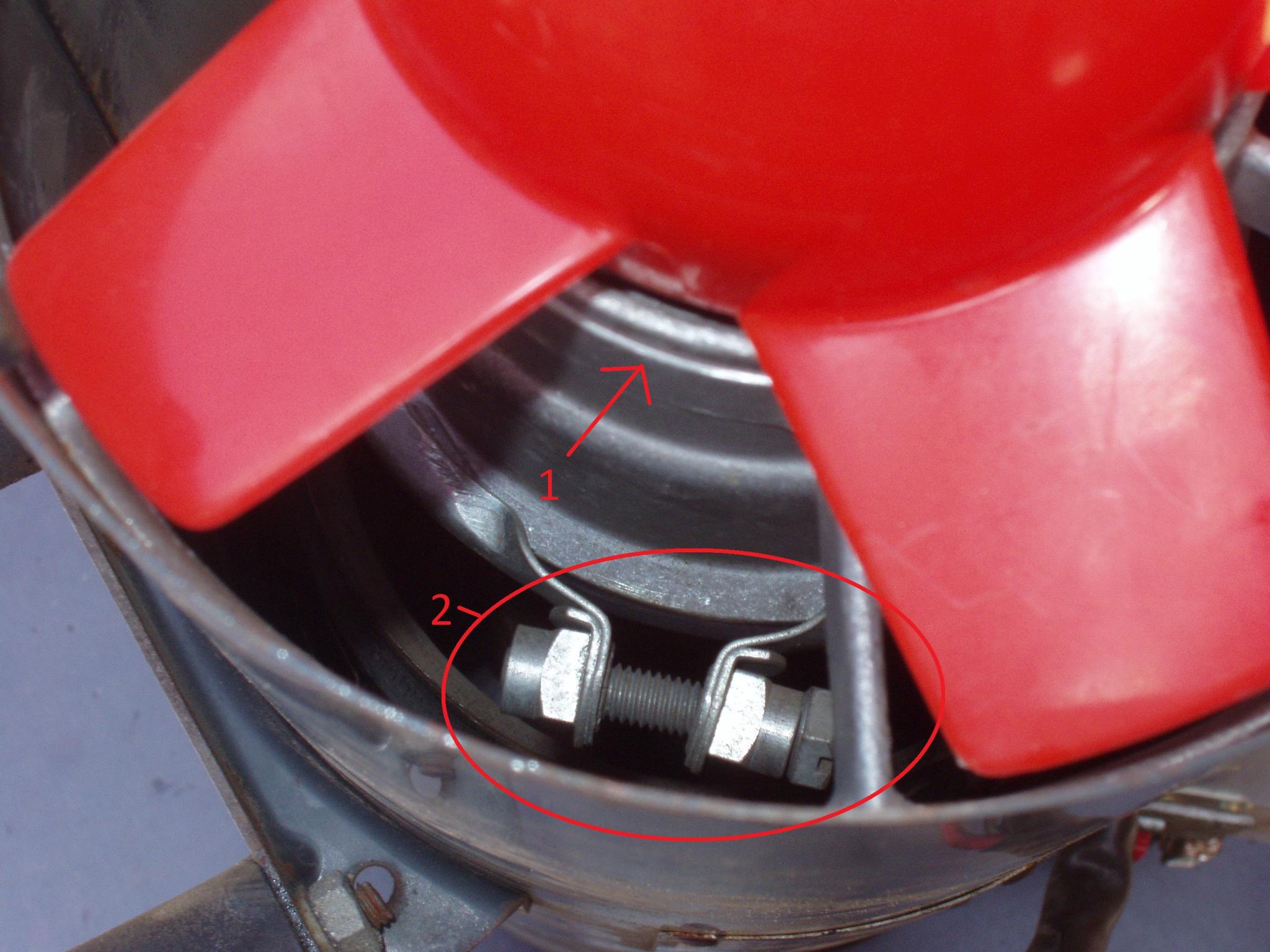 Ich will ja nur den Elektromotor ausbauen, um den Unterbrecher zu überprüfen, und nicht gleich das ganze Ding zerlegen. Der Propeller ist draufgeschraubt. Den wird man wohl erst ab bekommen, wenn der Elektromotor draussen ist. Sonst seh ich von oben nur 2 Möglichkeiten: Eine Klemme (siehe Bild unten Markierung 1, ist im Plan als Bauteil 12 angegeben), welche ich aber nicht aufbekomm und eine Schraube (siehe Bild unten Markierung 2, ist im Plan als Bauteil 18 angegeben). Von der Schraube hab ich noch die Finger gelassen, weil ich wie gesagt erstmal nicht das ganze Ding zerlegen will. Die Klemme würde sicher viel besser raus gehen, wenn der Propeller mal weg wäre..