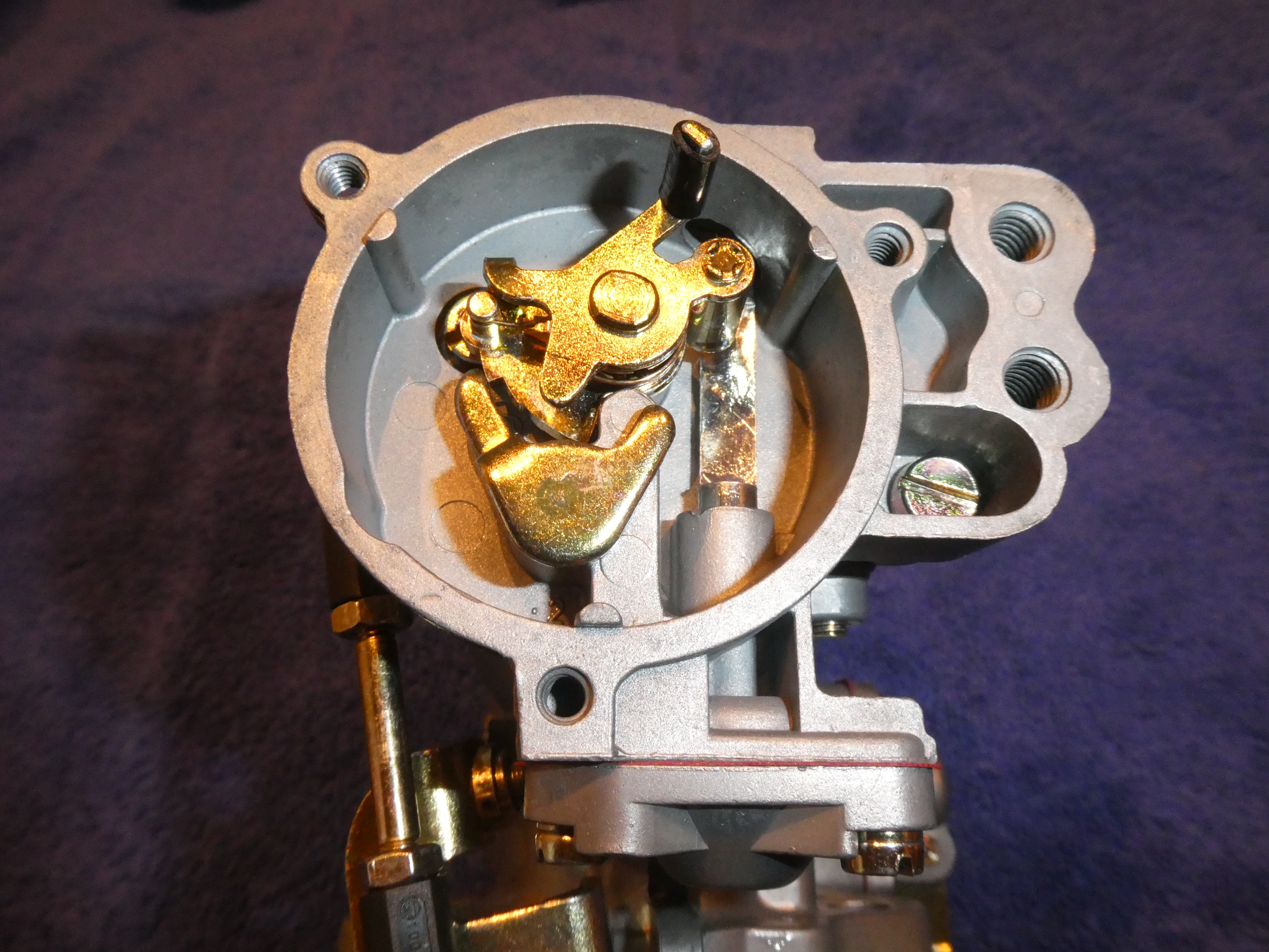 Auf der oberen Seite der Klappe kann man die Übergangsbohrungen für den Teillastbereich und die Bohrung für die Frühverstellung der Zündung sehen. Sie dürfen auf keine Fall von der Unterseite sichtbar sein.