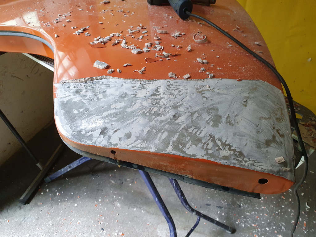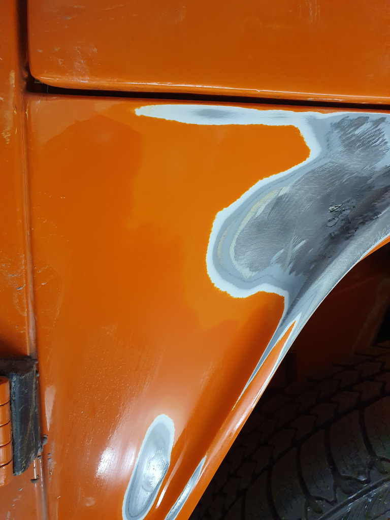 Nun ist das wieder mit minimalem Spachtel repariert und die Werkswellen sind wieder im Blech erkennbar.