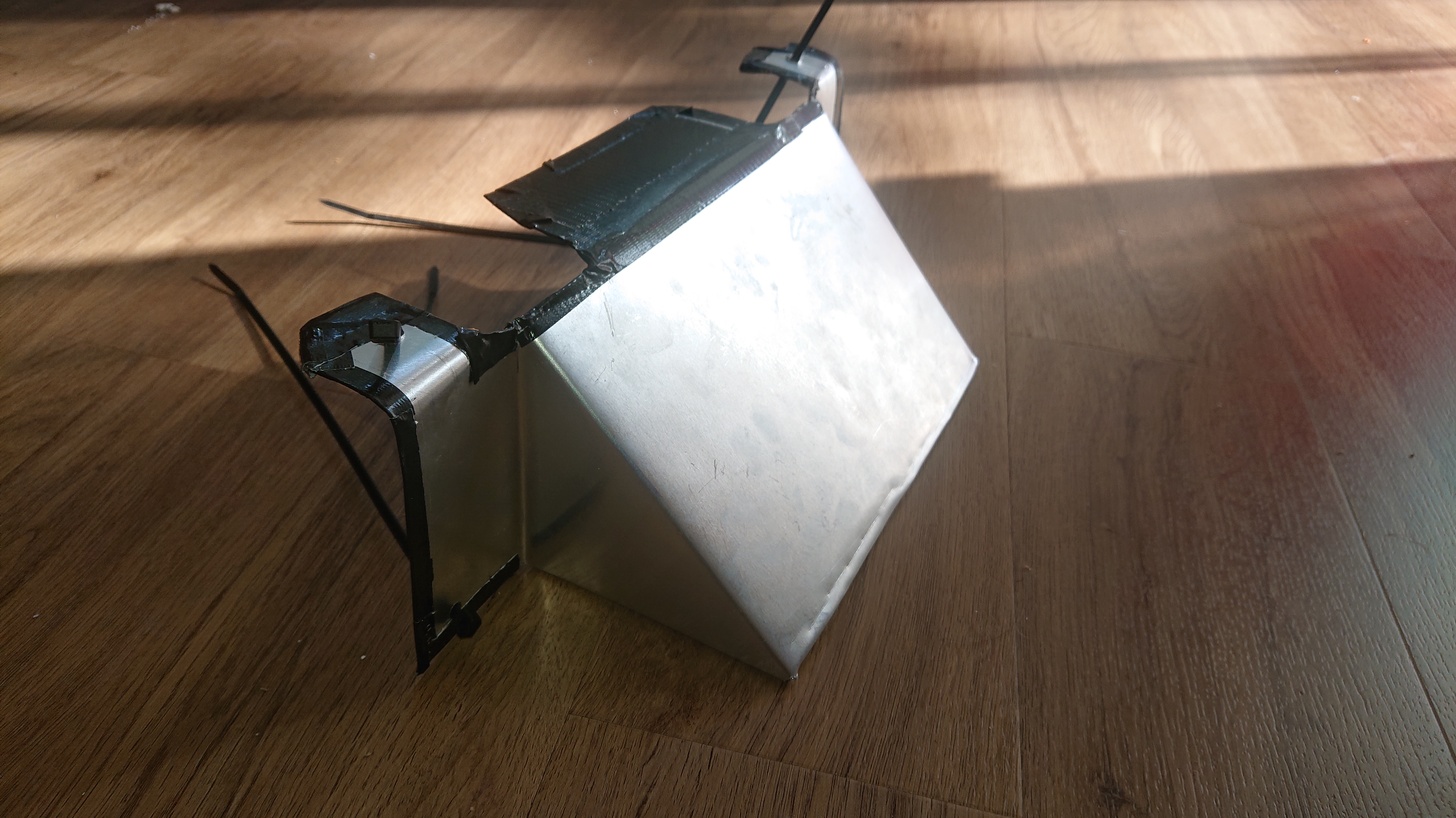 Deswegen habe ich mal fix mit meiner Tochter ein Pfuschblech zur Luftführung gebastelt. Erstmal nur grob und mit Kabelbindern um es zu testen.