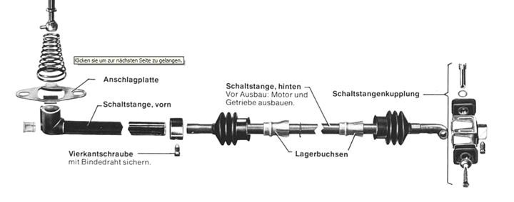 Hinten Schaltstangenkupplung ausbauen, vorne Schalthebel und Vorderteil der Schaltstange ausbauen.