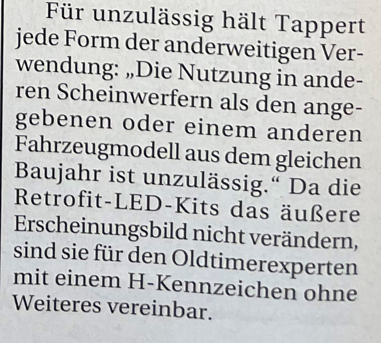 Der letzte Absatz und die Aussage, dass die LED-Kits mit einem H-Kennzeichen vereinbar sind, da sie das Erscheinungsbild NICHT verändern: