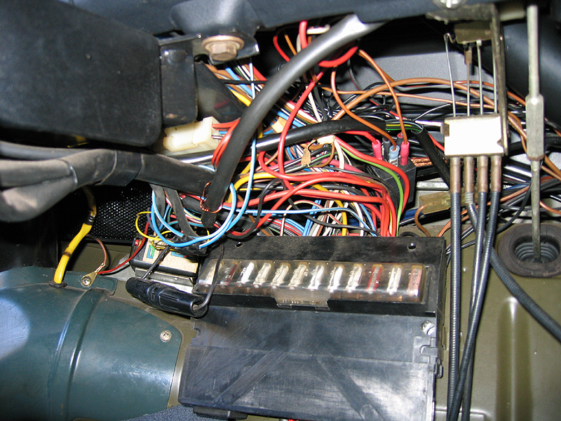 Hier ist das Ganze aus der Verkleidung heraus gezogen. Das braucht nicht - Ihr müßt nur an den abgebildeten Stecker heran, den könnt Ihr abziehen. Laßt Euch nicht von den abgebildeten Kabelfarben irritieren - ich hatte da schon was geprökelt. Bei Euch sollen da aus dem Stecker vier Kabel raus schauen: schwarz, schwarz/gelb, schwarz/grau und (schwarz/)grün. Sind da mehr Kabel: aufhören, für Dich gildet dieser Workshop nicht ;-)