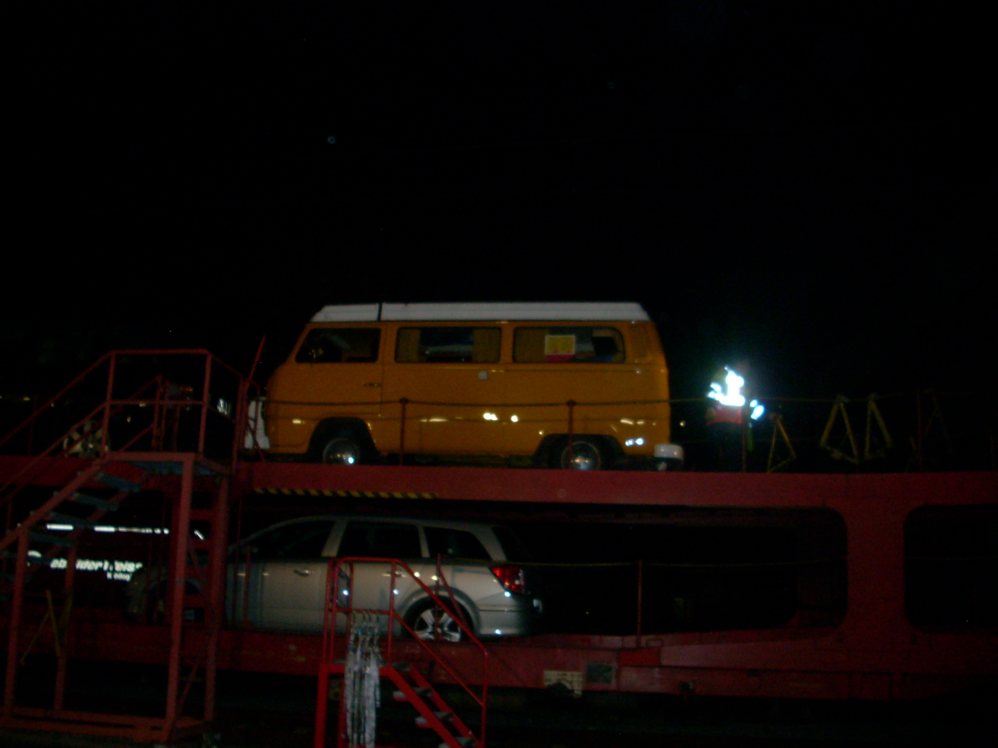 Runter ging dann sehr schnell, der Zug hielt, 3 min spaeter kamen die Autos auf dem gegenueberliegenden Gleis an, und dann hiess es auch schon runter zu fahren, und zwar wie es mir schien direkt in den Bahnhof hinein