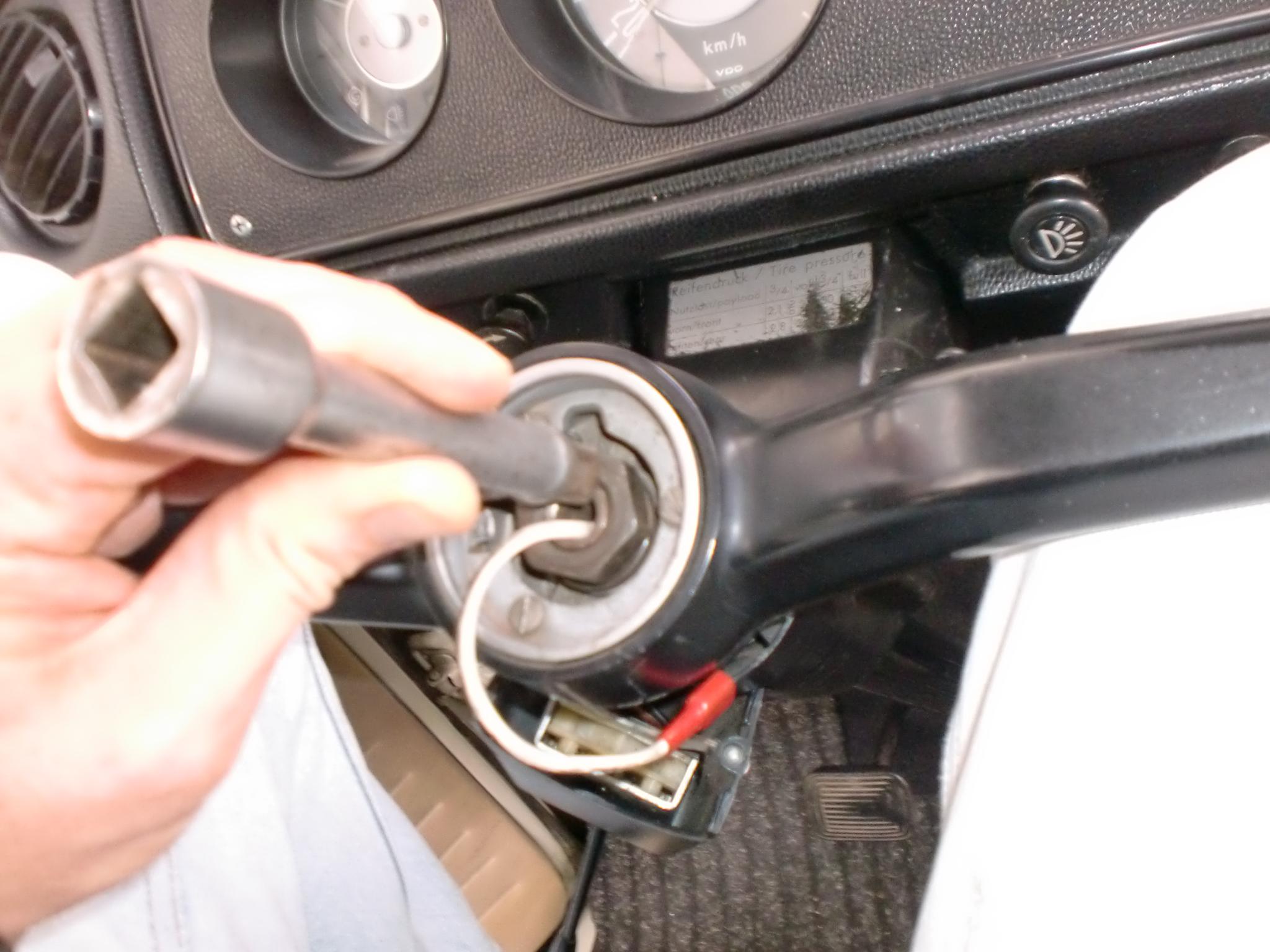 Seine Kniee ganz fest und stramm mit Druck unter das Lenkrad stemmen und eine Eisenstange o. Ä. (ich nehme immer ne 3/4" Ratschenverlängerung) halb auf die Mutter und halb auf die Lenkstange ansetzen und dann mit kräftigem Fäustel (500g) auf die Stange (Ratschenverlängerung) schlagen. Wichtig ist der kräftige Druck mit den Knieen nach oben !