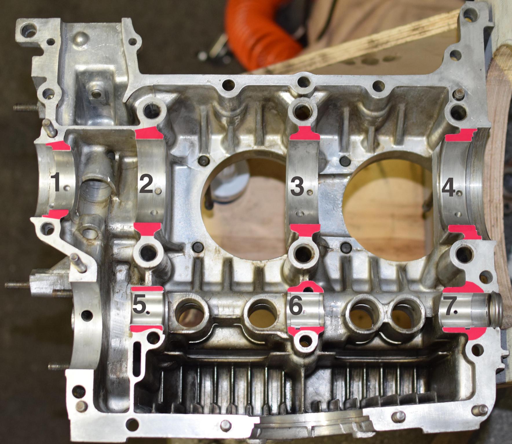 Auf dem Bild mit der linken Motorhälfte fehlen die Passstifte an den Lagern 1,3 und 4, wobei in der anderen Gehäusehälfte dem Lager 3 gegenüber ein Stift vorhanden ist.