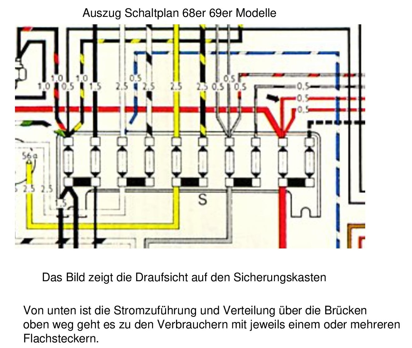 Ich erkenne in der Tat, daß dort nicht gebrückt ist. Aber dessen Einsatzzweck läßt sich anhand von Schaltplänen (Hinweis bekamst Du ja schon) sicherlich feststellen, siehe einfach die schematische Darstellung von Norbert. Plakativer kann man es nicht darstellen, und anhand dessen mußt Du einfach nur die verschiedensten Schaltpläne durchforsten, um zu einem Ergebnis zu gelangen. Oder auch Gehirnschmalz nutzen: Welche Verbraucher liegen dort auf, und was könnte der Grund sein, sie versorgungsseitig voneinander zu trennen...?