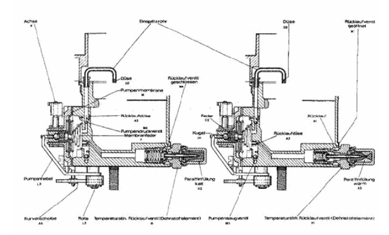 Paraffinfüllung warm, Rücklaufventil offen, eine Teilmenge (begrenzt durch die Rücklaufdüse) wird zurück in die Schwimmerkammer geleitet. Die Restmenge geht durch das Einspritzrohr.