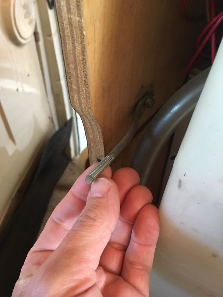 eine Schraube, die den Block an der Rückseite der Beifahrersitzwand hält. Tür-seitig ist in dem Küchenblock auch eine Bohrung,