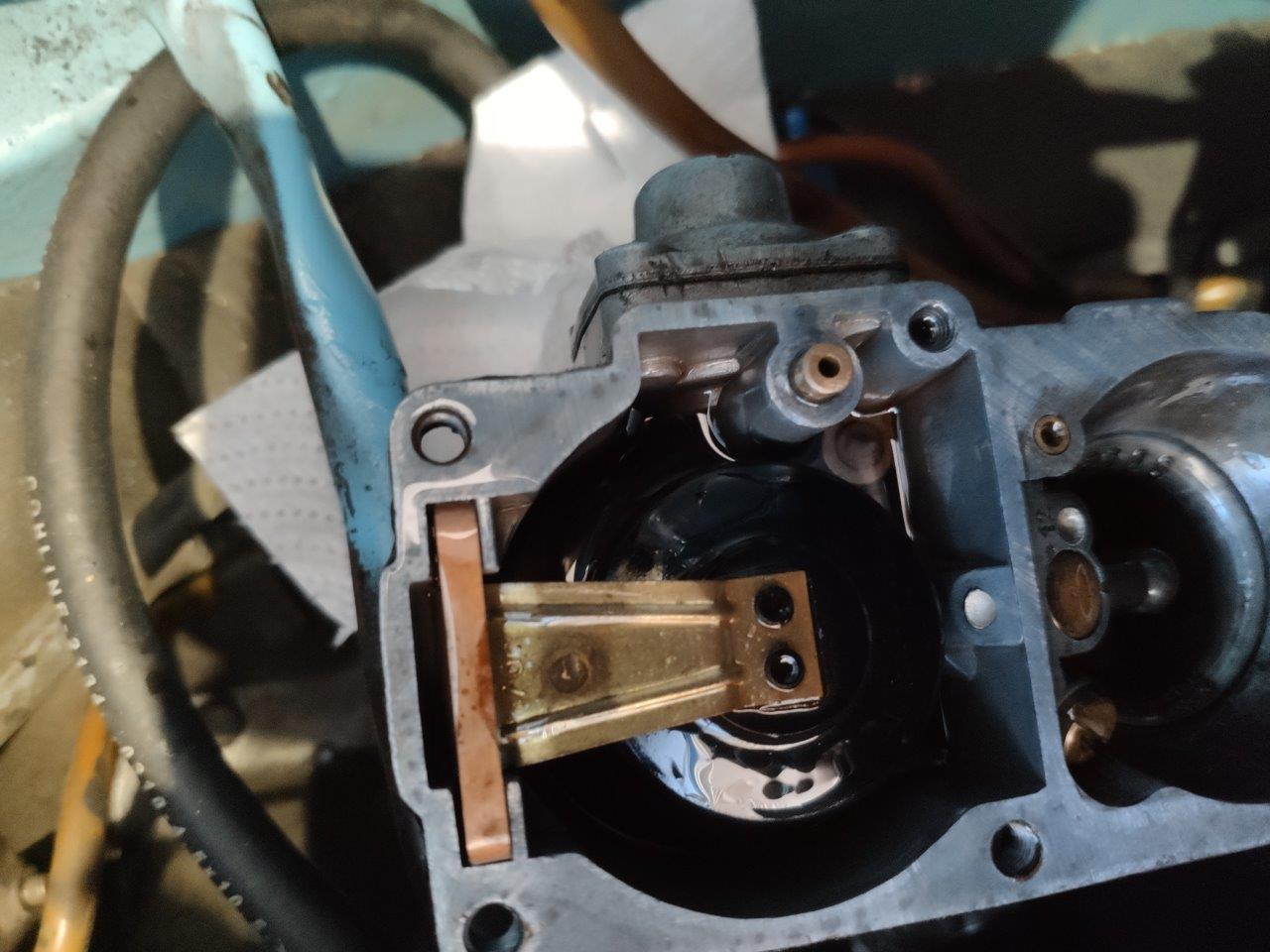 Ich habe dann den Vergaser auseinandergebaut, d.h. das Oberteil abgenommen und die Durchgängigkeit des Röhrchens und des Oberteils geprüft, das war kein Problem.