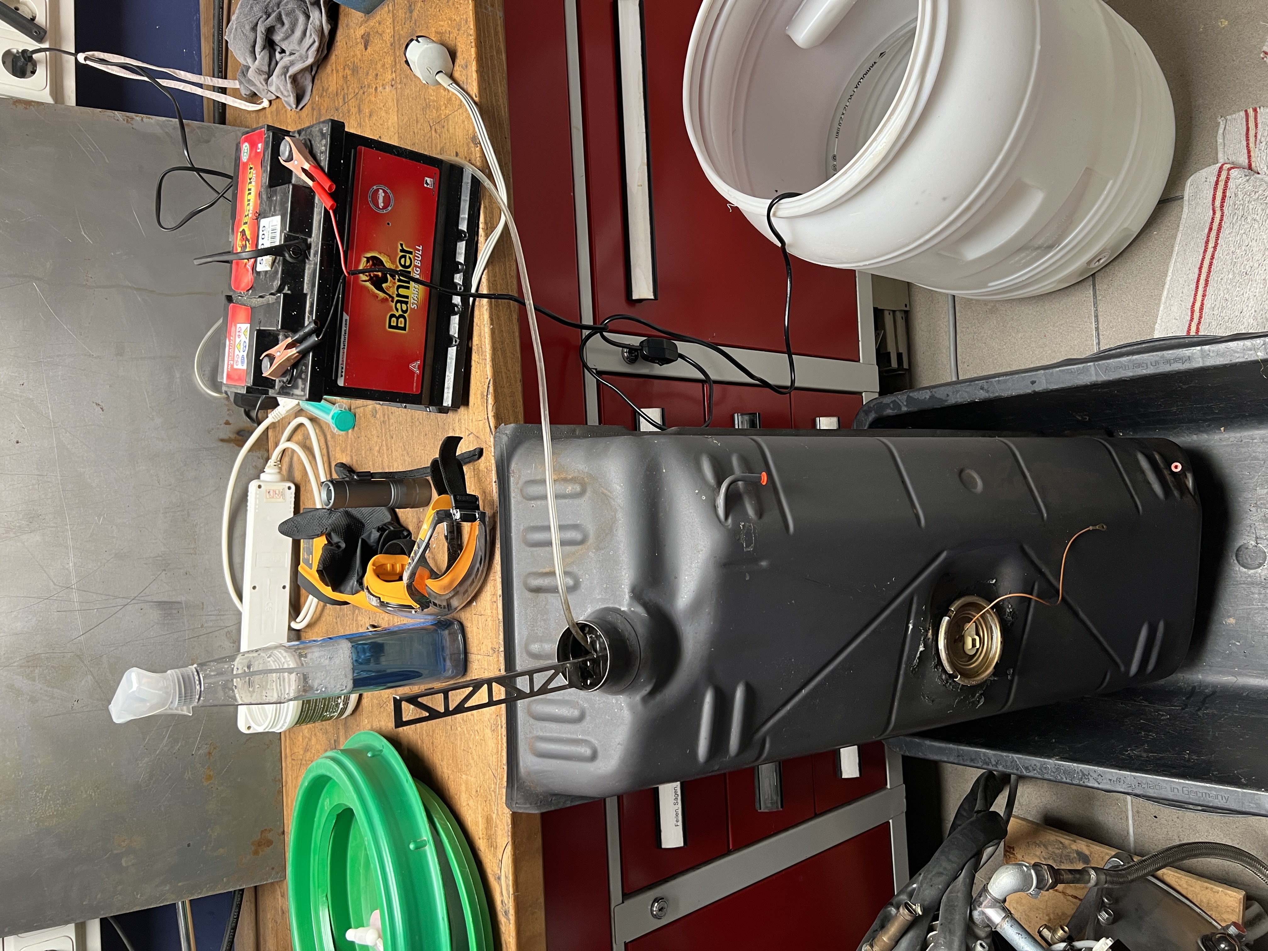 Alle Öffnungen abgedichtet (nach mehreren Versuchen: es funktionieren nur richtige Stopfen die in die Röhrchen kommen, für das Loch vom Tankentnehmer habe ich am Ende den Tankentnehmer selber genommen) und in eine Auffangwanne gestellt (wichtig!) Vergesst alle Versuche mit Klebeband oder ähnlichem!